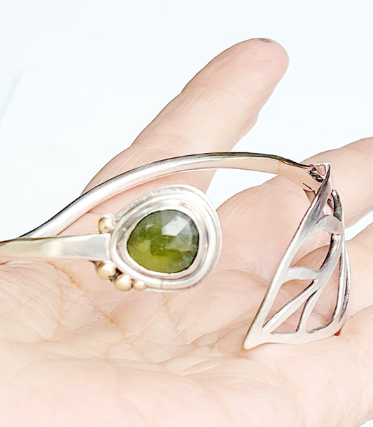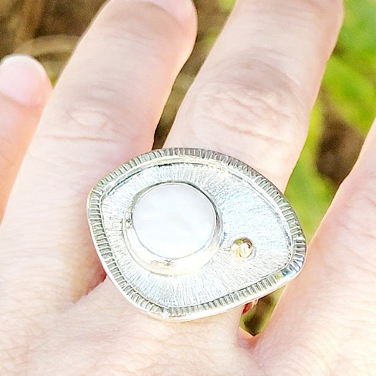 Handmade Sterling Silver Ring with Pearl and 14K Gold detailing.