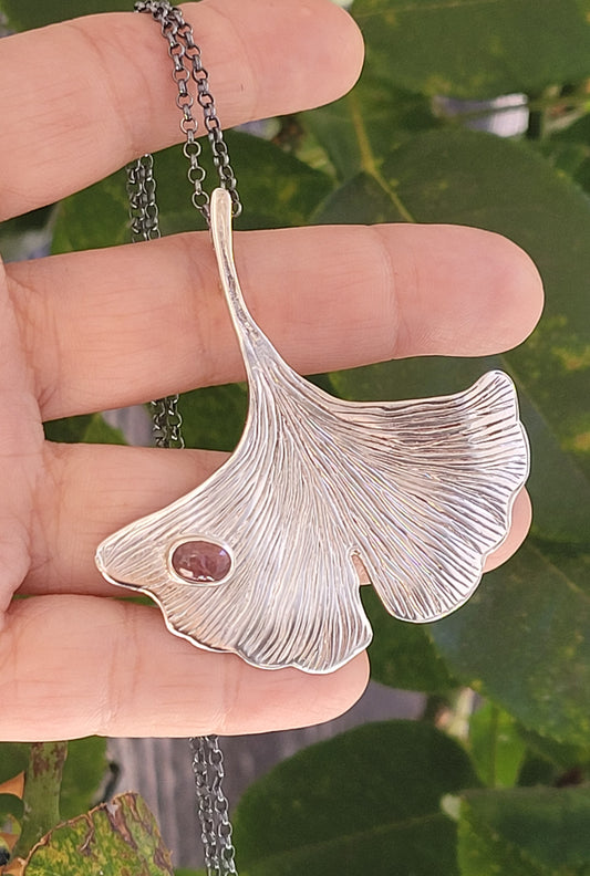 🌱 Ginkgo Biloba 🌱 Pendant chiseled in Sterling Silver with a Rubellite Tourmaline