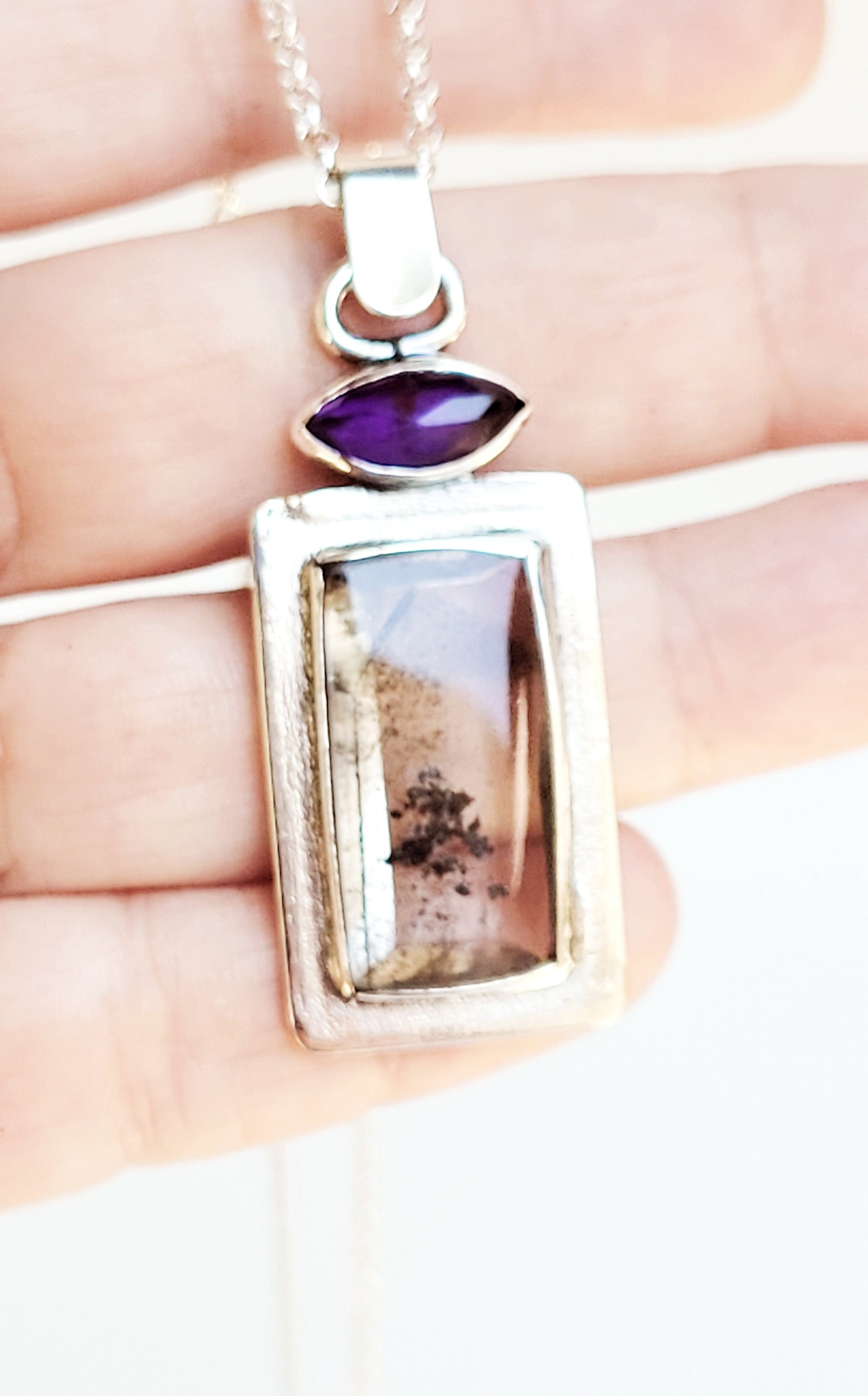 This pendant is made of Sterling Silver with Amethyst and dendrite quartz settings.